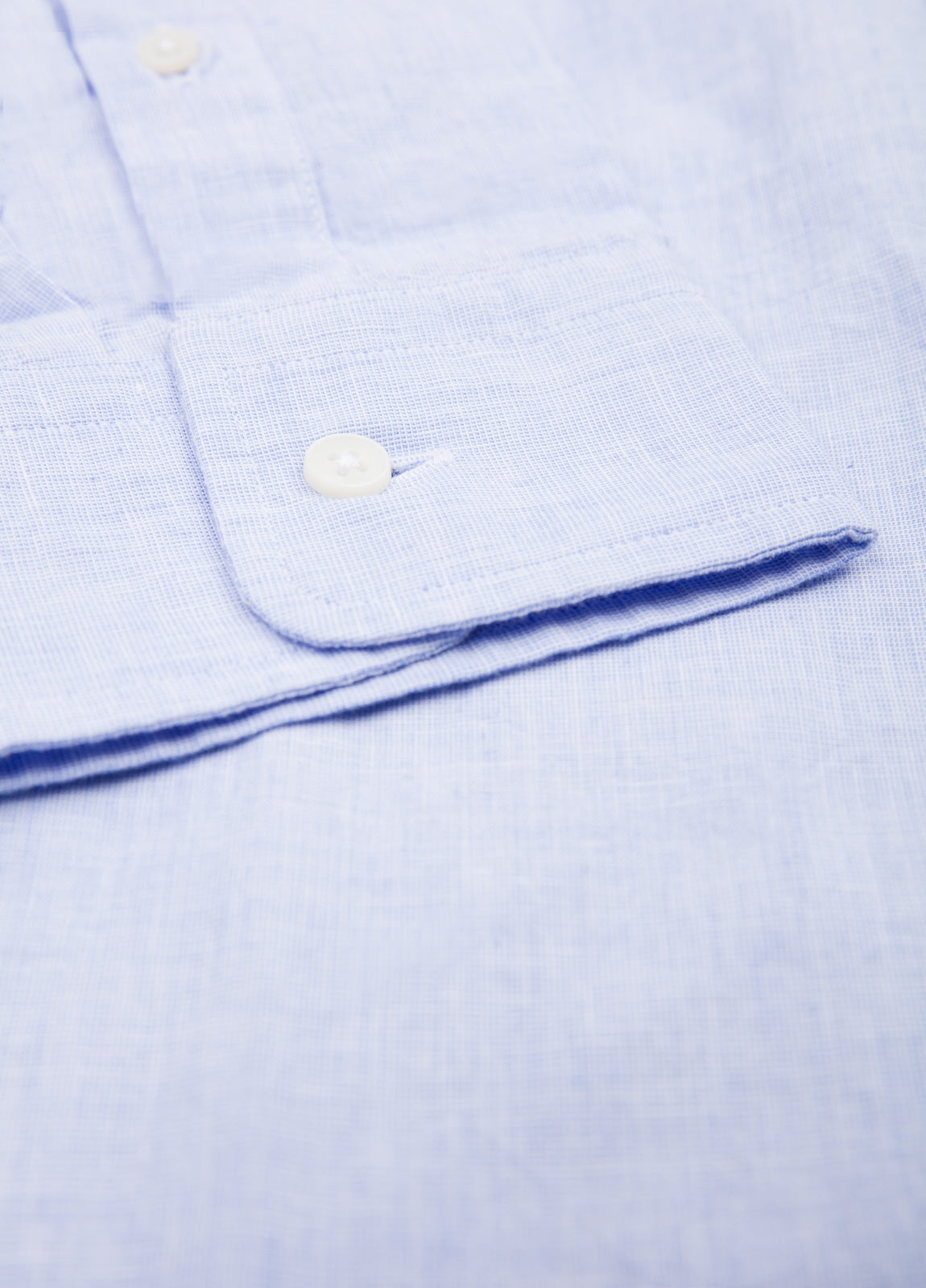 CARACTERISTICAS: Camisa lisa. Patronaje regular. Cuello con botón. Puño simple con doble botón. Con pliegue en espalda. Con bolsillo en pecho. Color celeste. COMPOSICION: 70% Algodón. 30% Lino.